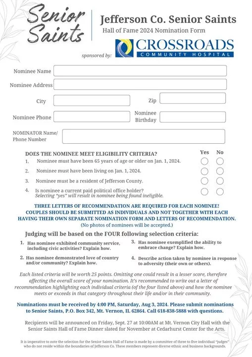 Jefferson Co. Senior Saints is accepting nominations for the Senior Saints Hall of Fame. Nominations must be received by August 3, 2024. Recipients will be announced Friday, September 27th at 10:00 am at Mount Vernon City Hall. The Senior Saints Hall of Fame dinner is slated for November at Cedarhurst Center for the Arts.